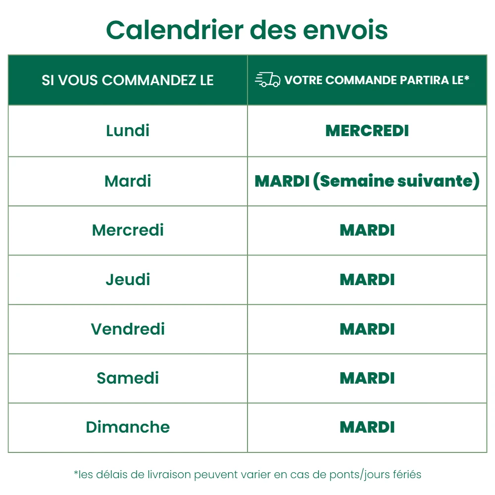 En Colissimo ou courrier suivi : Départ du mardi au mercredi : livré en ≈48h.