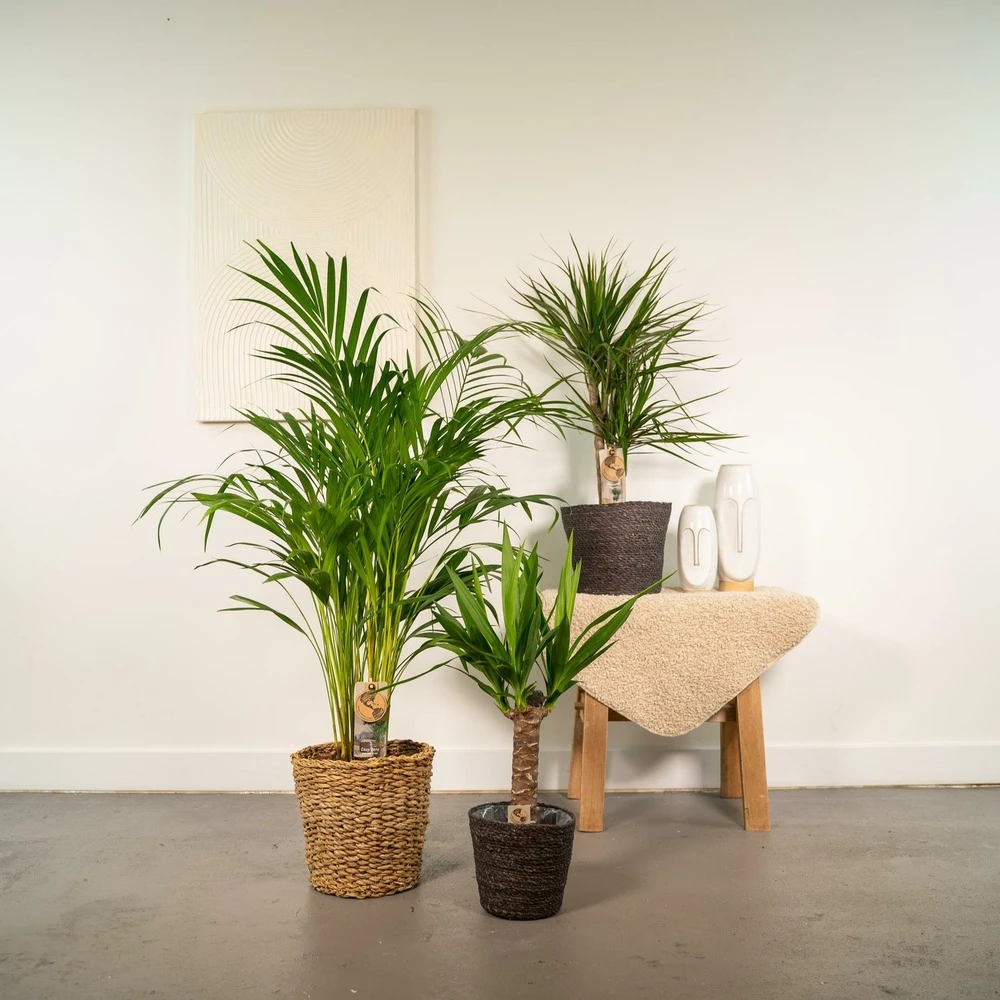 Cet ensemble de trois plantes d’intérieur se compose d’un palmier areca de 120cm, d’une dracaena de 70cm et d’un yucca de 60cm. Le palmier areca aussi connu sous le nom de palm ou dypsis lutescens, la dracaena marginata, également connue sous le nom de dragon blood tree, et le yucca, également connu sous le nom de palm lily, sont trois plantes d’intérieur exotiques. À l’origine, le palmier areca vient d’asie du sud-est, le yucca du nord et du sud de l’amérique et la dracaena de l’afrique, les tropiques d’asie et l’amérique centrale. Ce mélange de plantes d’intérieur fournira une atmosphère verte à votre maison ! Ce trio de plantes d’intérieur est expédié directement de la pépinière à votre adresse d’expédition. Prenez soin de l’areca, du dracaena et du yucca. La dracaena adore être à l’ombre ! L’areca aime la lumière mais préfère éviter le soleil direct. Lorsque son terreau est sec, c’est qu’il est temps d’arroser les plantes d’intérieur. Le yucca, cependant, aime être au soleil à une température comprise entre 15 et 24 degrés. Un arrosage une fois tous les 14 jours est suffisant.