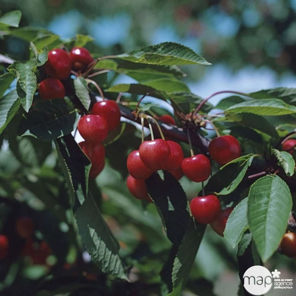 Aussi appelée ‘Souvenir des Charmes’, cette variété se prête à toutes les formes et demande donc peu d’entretien. Elle est moyennement vigoureuse, fertile, et rustique, aussi peu sensible à l’éclatement. Fin mars voire début avril, des fleurs blanches immaculées ornent l’arbre. A l’abri des gelées, il peut être planté partout en France. Le fruit est un bigarreau qui se récolte fin mai à début juin. Ce sont de grosses cerises en forme de coeur, de couleur rouge, noire à maturité, que l’on récolte entre fin mai et début juin. La chair de couleur rouge clair, est ferme, juteuse et sucrée. Le feuillage s’intensifie de jaune orangé à l’automne. Cette variété se pollinise avec ‘Van’ ou ‘Marmotte’.
