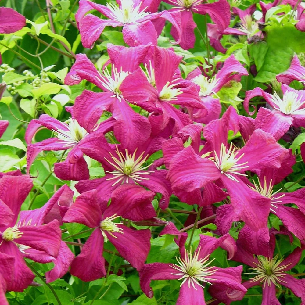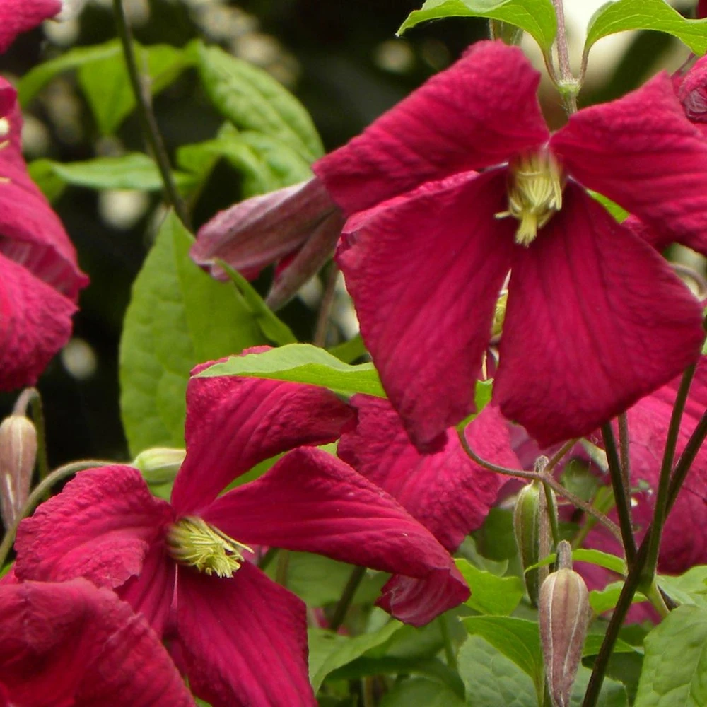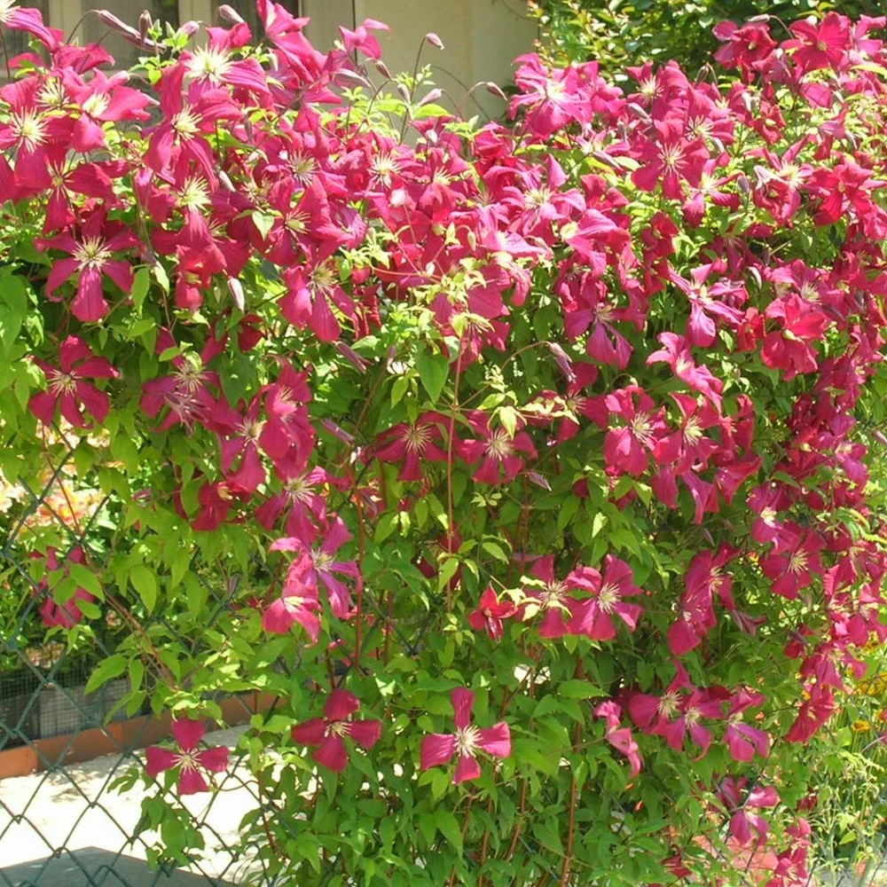 fleurs en clochettes rouge écarlate. Cette jolie clématite a été obtenue en france vers 1900, elle est issue d’un croisement entre la clématite ville de lyon et la clématite rubra grandiflora.