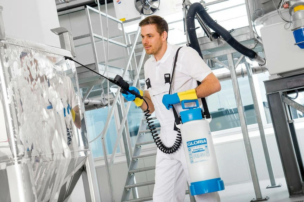 Pulvérisateur à pression performant pour l’application de mousse de nettoyage 5 L capacité Matériau d’étanchéité Viton Tuyau spiralé de 2,5 m Degré de moussage variable Réducteur de pression avec manomètre Buse à jet plat avec angle de pulvérisation de 110°. Information sur le produit :Le pulvérisateur de mousse d’une capacité de 10 l GLORIA FoamMaster FM 50 est équipé de joints Viton robustes ainsi que d’une buse à jet plat intégrée avec un angle de pulvérisation de 110 ° et transforme les détergents en une mousse de nettoyage efficace qui agit de manière intensive sur la surface à traiter et peut atteindre un résultat de nettoyage encore plus profond. D’autre part, la mousse de nettoyage est économique et permet ainsi d’utiliser sensiblement moins de détergent. Le FM 10 convainc grâce à son tuyau en spirale de 2,5 m de longueur et sa vanne à fermeture rapide à manomètre intégré, comme outil efficace et confortable pour le nettoyage de voitures et de machines ainsi que pour les travaux de nettoyage dans le secteur des sanitaires, des piscines ou même des cantines. Différents degrés de moussage sont nécessaires pour les applications les plus différentes. Le principe d’action du FM 50 peut donc être varié en quelques mouvements à l’aide des différentes buses interchangeables. La buse à jet plat spécialement mise au point pour ce pulvérisateur assure en plus une application régulière du liquide utilisé. Une pompe à pression performante, un réservoir en plastique robuste et un socle pour une stabilité sûre garantissent un travail toujours confortable. Détails techniques : Capacité 5,00 L Pression max. 3.0 bar Joints en Viton (FKM) Lance de pulvérisation en plastique Pompe en plastique Tube en spirale Soupape de sécurité Vaporisateur de mousse Avec connexion compresseur Capacité totale 12,20 L Récipient en plastique robuste Version résistante à l‘huile Buse à jet plat en matière plastique Vanne à fermeture rapide Socle Bande indicatrice de niveau transparente Manomètre
