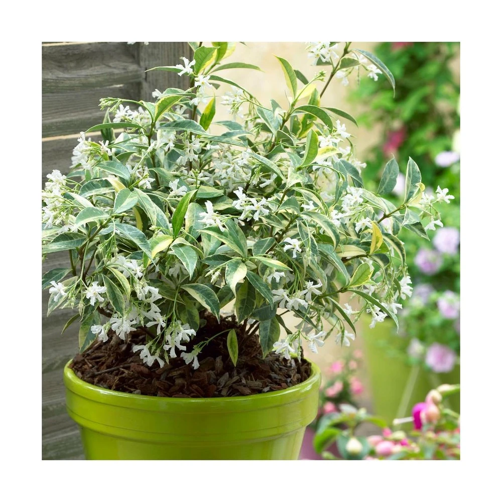 le trachelospermum jasminoides sun lover® est une variété de jasmin étoilé au joli feuillage panaché blanc et jaune, persistant. sa floraison blanche est impressionnante en plein été.