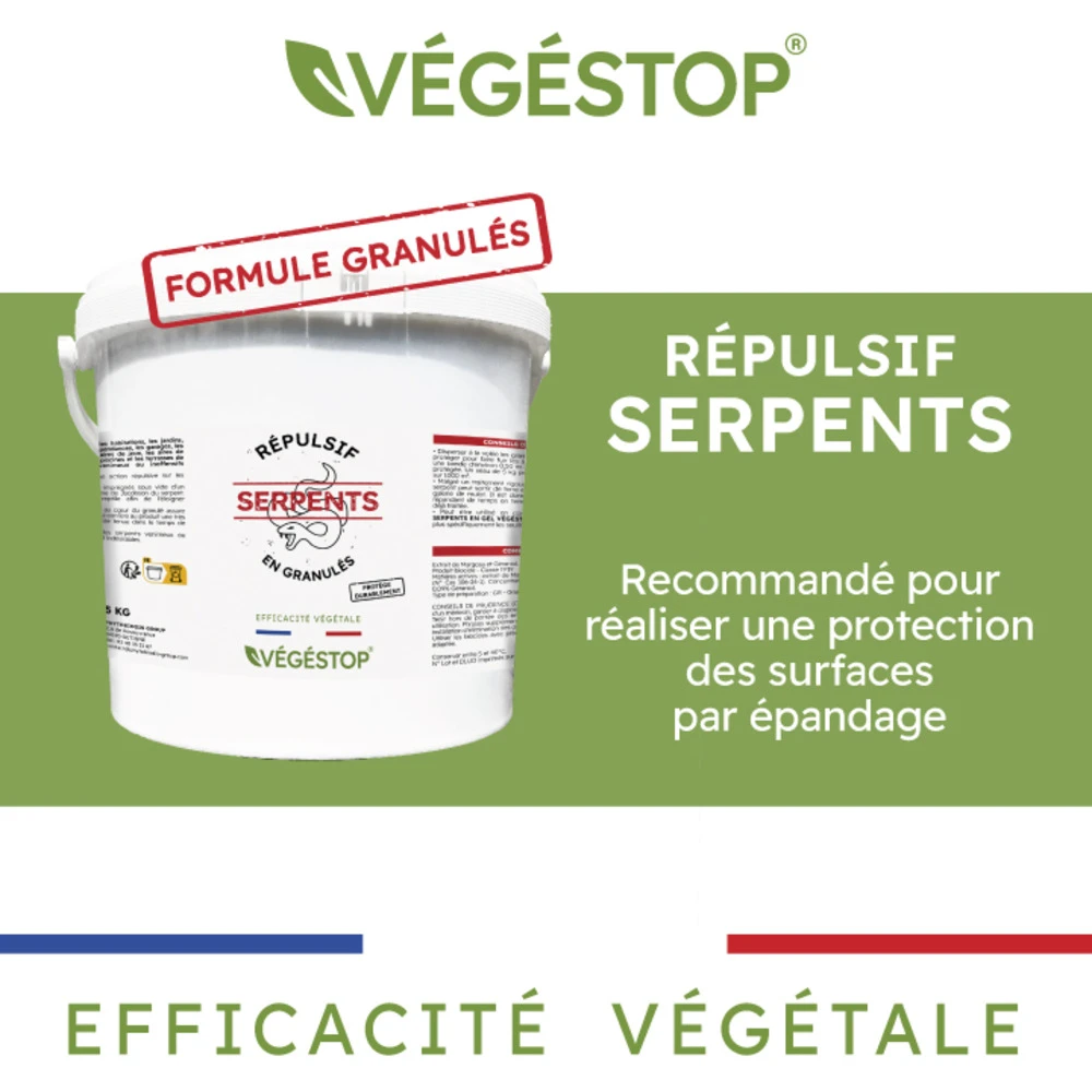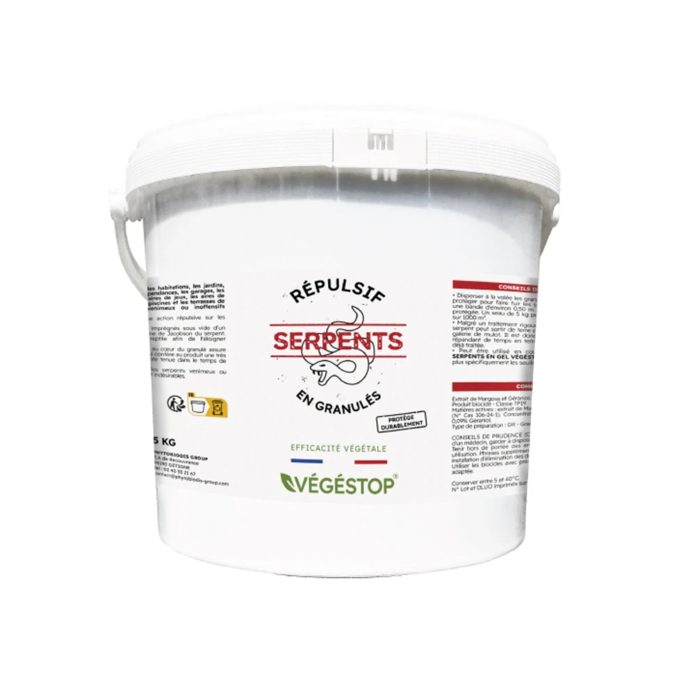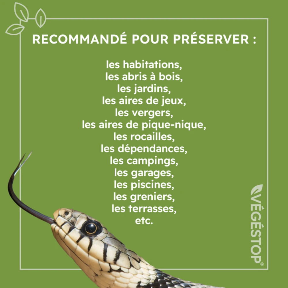 Le répulsif serpents en granulés vegestop est recommandé pour préserver les habitations, les jardins, les vergers, les rocailles, les dépendances, les garages, les greniers, les abris à bois, les aires de jeux, les aires de pique-nique, les campings, les piscines et les terrasses de la présence de serpents, venimeux ou inoffensifs (couleuvres, vipères, etc). Les granulés de céréales sont imprégnés sous vide d’un principe actif qui perturbe l’organe de jacobson du serpent. Cet organe programme le reptile afin de l’éloigner durablement de la zone traitée. L’imprégnation du principe actif au cœur du granulé assure une diffusion lente et continue qui confère au produit une très bonne efficacité et une excellente tenue dans le temps de l’effet répulsif. Le répulsif serpents en granulés vegestop est conçu pour éloigner les serpents venimeux ou inoffensifs des endroits où ils sont indésirables.