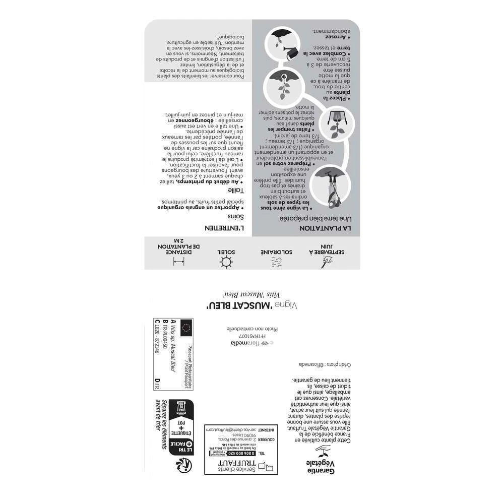 Le genre Vitis (vigne) comprend environ 60 espèces, originaire des rĂ©gions chaudes et tempĂ©rĂ©es de l’hĂ©misphère Nord. Vitis vinifera (vigne Ă vin et vigne de table) est l’espèce la plus connue, originaire vraisemblablement de la rĂ©gion sud-caucasienne et cultivĂ©e dĂ©s la fin du IVème millĂ©naire au Proche Orient. Elle fut introduite en Gaule par les Romains dans la province de la Narbonnaise. Muscat est une dĂ©nomination qui recouvre un ensemble d’environ 200 cĂ©pages dont les raisins ont un arĂ´me muscatĂ©, c’est-Ă -dire très parfumĂ©, rappelant lĂ©gèrement celui du musc. Il en existe de nombreuses variĂ©tĂ©s, dont les grains ont une peau allant du jaune pâle au bleu-noir. ‘Muscat Bleu’ est une variĂ©tĂ© qui a la particularitĂ© de produire des grappes aux grains rouge foncĂ© recouverts d’une pruine bleutĂ©e. Chair bleutĂ©e, ferme, juteuse, acidulĂ©e, au goĂ»t muscatĂ©. MaturitĂ© en septembre. Cette liane formant un cep est souple et se conduit facilement de façon Ă former des cordons, des gobelets, Ă couvrir des treilles et des pergolas, Ă se palisser contre les murs. Plus simple encore : on peut la laisser partir Ă l’assaut de pylĂ´nes. Une solution pratique dans les tout petits jardins. Pousse au soleil dans un sol lĂ©ger, permĂ©able.